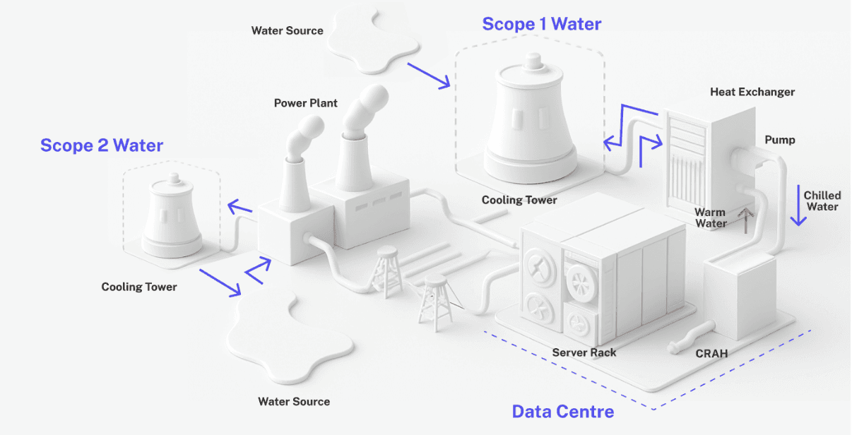 An example of data centre’s operational water usage: on-site scope-1 water usage for data centre cooling (via cooling towers in the example), and off-site scope-2 water usage for electricity generation. The icons for AI models are only for illustration purposes. | Source link