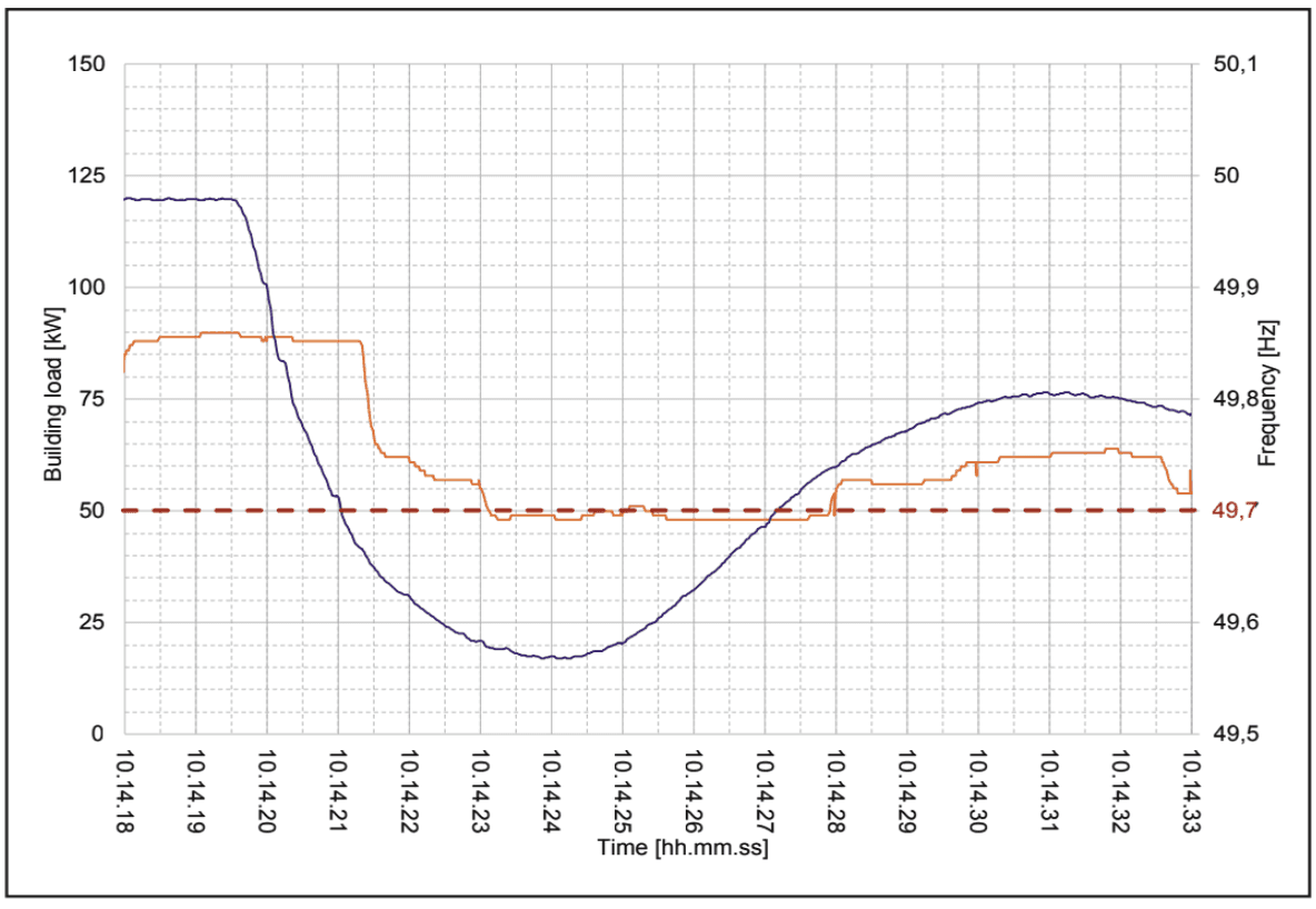 UPS provides fast response to frequency deviation. Response (static 25 kW) activated through external signal once frequency drops below threshold value (49,70 Hz). Power grid frequency (purple) and building load (orange) plotted during one event | Source link