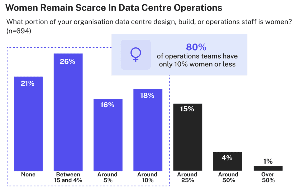 What portion of your organization’s data center design, build, or operations staff is women? (n=694). Data centre teams employ around 10% or less women and 20% of organizations employ no women at all. | Source link