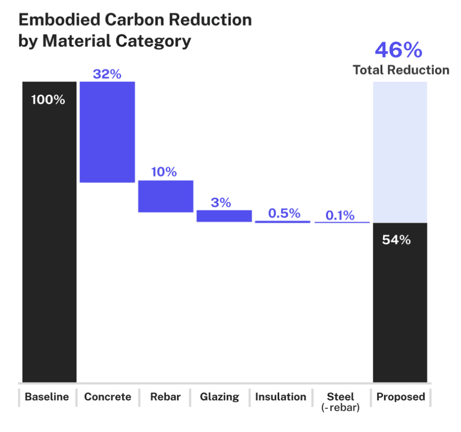 An example of a mid-rise concrete and steel construction showing the embodied carbon reduction by material category, RMI 2021 | Source link